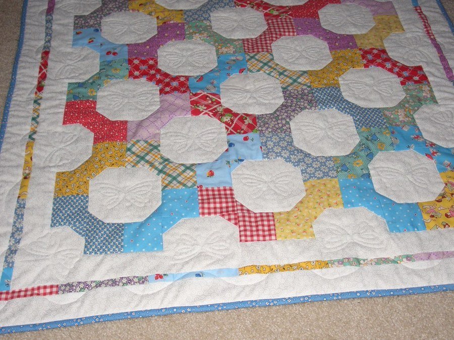 OCCAT1 A Quilt for Gabrielle - This quilt was made for my first grandchild, who was born in July 2010. It's a perfect size for a little one with bright colors. The fabrics are Aunt Grace reproductions, some of the patterns being similar to ones that were in a quilt my grandmother made for me.
