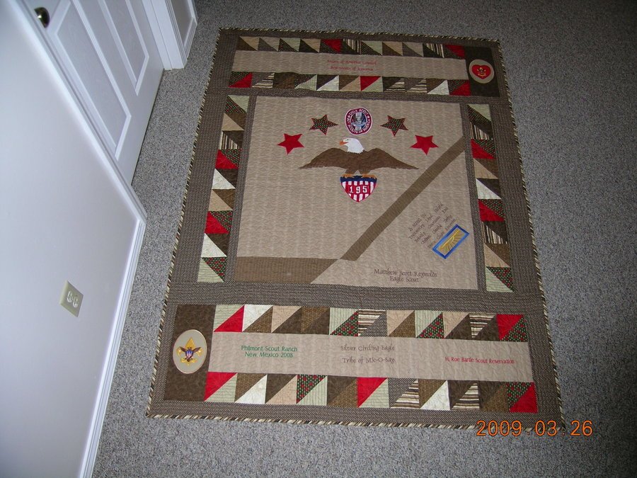| Design Source - Description | This quilt was made for my grandson's Eagle Scout Celebration. He became an Eagle Scout when he was 14. He picked the various badges appliqued to the quilt that were important to him personally. |