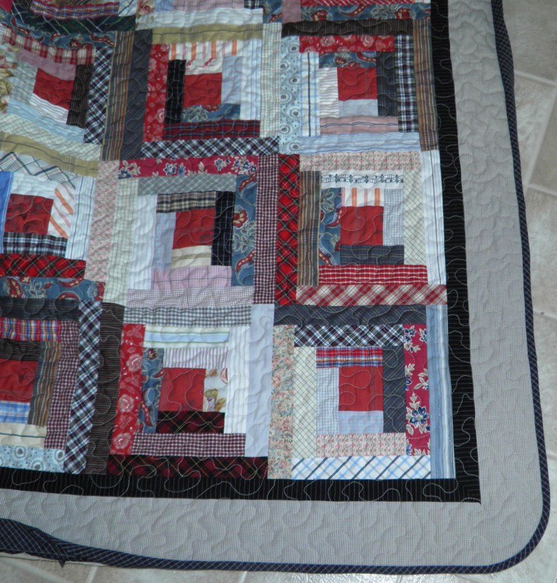 JudyPete Log Cabin Recycled Shirt Quilt - I love the use of recycled shirts in making this log cabin quilt. This time I used a rounded corner on the edging and am pleased with out that turned out. Batting is Hobbs Heirloom 80/20. Fabrics are all 100 percent cotton gleaned from men's shirts.