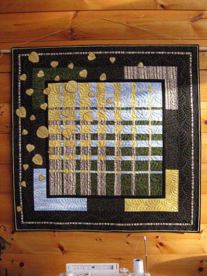 fortquilt Quaking Convergence - This design was inspired by one appearing in Ricky Timms' "Convergence Quilts." This convergence quilt uses four fabrics representing aspen tree trunks, aspen tree leaves, the sky and other green vegetation. These fabrics are repeated in the setting at opposite corners from the placement in the convergence. I used the leaf fabric to applique aspen leaves of different sizes as if they are falling from a tree. The leaves are appliqued with a variable width satin stitch using a brown and tan shaded thread; the leaf veins were quilted using the same brown thread. All the machine quilting was done with a gold-colored thread in spiral and feather motifs. More images of this quilt are available at http://quiltsbyjoyce.wordpress.com/2010/11/26/quaking-convergence/