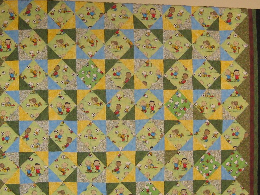 | Design Source - Description | Fussy cut Peanuts Soccer fabric and extended pattern to a full-size bedspread. |