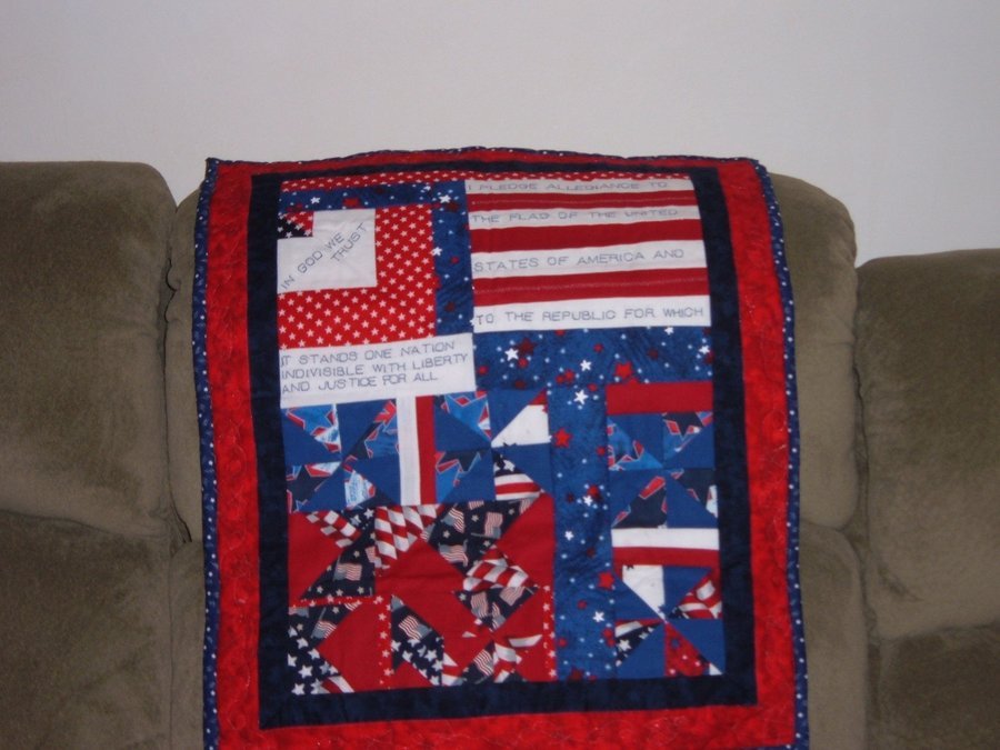 Regal A Flag for Lou - Red, White and Blue, all cotton. My sister called and asked me to make a small quilt for a lady that was dying of cancer. I had scraps of from a previous quilt, and decided to design something for her. A year later Lou pass away, and my sister told me she love the quilt so much that her husband buried her with it. I was so honored. The Pledge of Allegents is embroidery on the quilt.