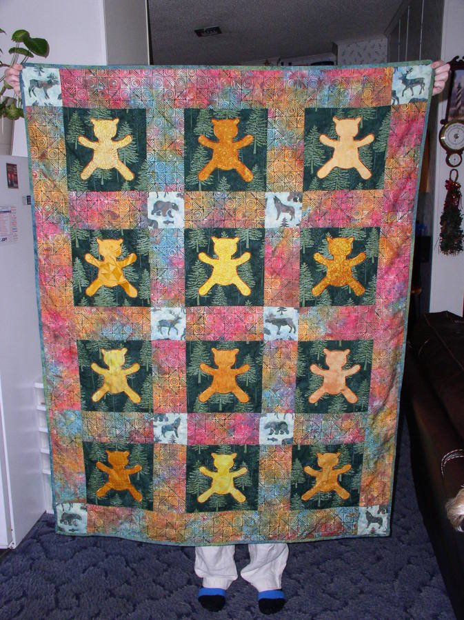 | Design Source - Description | Honey colored Teaddy bears appliqued onto hunter green batik background. Colorful sashing and small batik animal blocks at sashing intersections. |