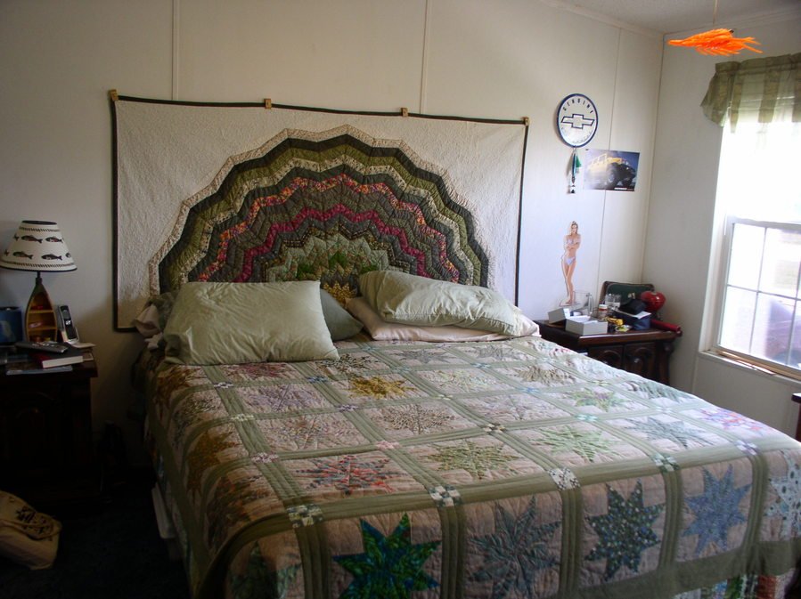 Studio1641 I Love Olive - Forty-two 12 inch Lemoyne Star blocks in Olive Based fabrics, with solid olive sashing, small 9-patches at sashing intersections and a bar border. Hand-quilted by myself. This quilt took me 5 years to complete. I recently rebound it, replaced one of the stars and quite a few of the border bars. I use this quilt on my bed all the time!