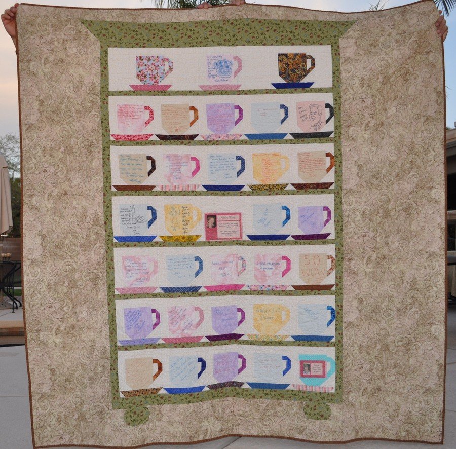 HstnQuilter Cindy's quilt back - If you have teapots you need teacups! Family and friend sent birthday wishes.