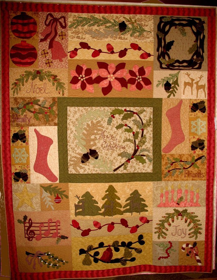 rahhawley Christmas Memories - This quilt is machine appliqued using raw edge fusible and stitched by a machine blanket stitch. I replaced a couple of the original blocks to reflect my own memories of Christmas