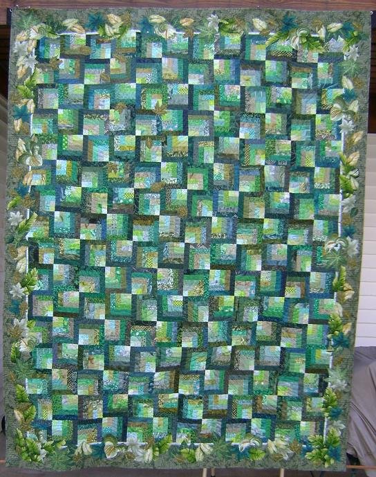 jayardi Simply Glowing - Only GREEN fabrics were used. Quite a few were donated by friends to help get a wide variety. There are over 300 different fabrics. Then it took over a month to organize them all into value order. The border is all individually hand cut leaves from pre-printed leaf fabrics then raw edge appliqued, based on a photo I saw of the blended borders technique. Free motion quilted on my Sapphire echoing the border and and a few leaf motifs. Which gives it the feel of swirling leaves.