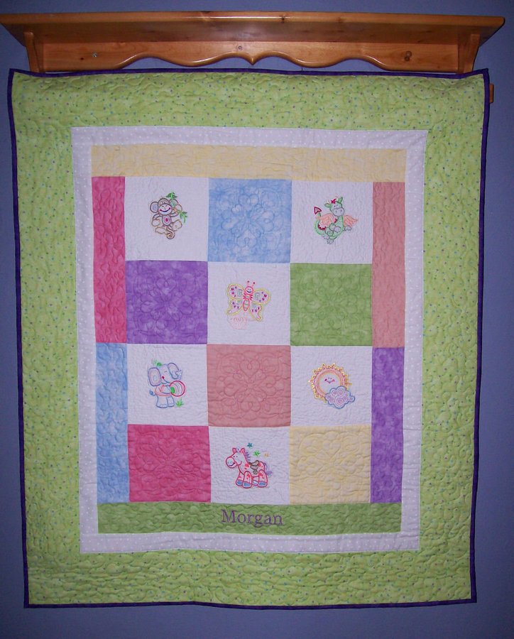 marie1961 Morgan's Quilt - This is one of the baby quilts that I make. I usually use softer colors for newborn babies, but when Morgan's parents were expecting her, they did not know if it was a boy or a girl, so I waited until after she was born to make her quilt. This more of a toddler design. I used embroidery designs from OESD, and the quilting is done by machine.