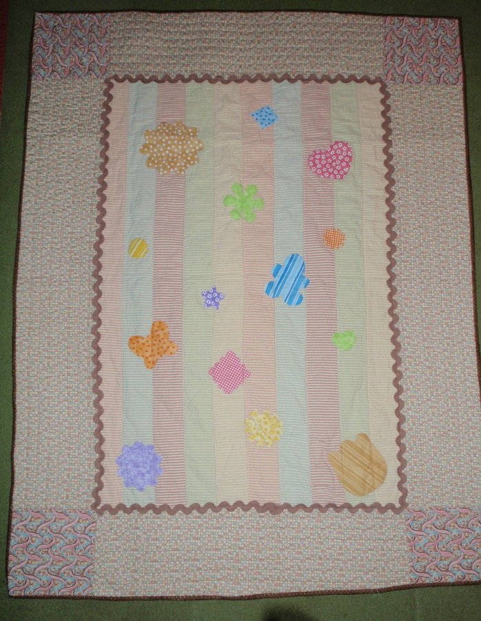 blackdog Harper's baby quilt - Very Simple quilt. I used pieced Moda fabric for the front panel and cut outs from another fabric by Moda that I fused onto the pieced panel. I added 2 other fabrics for the borders and quilted in straight lines. I had this quilt done in about 3 days.