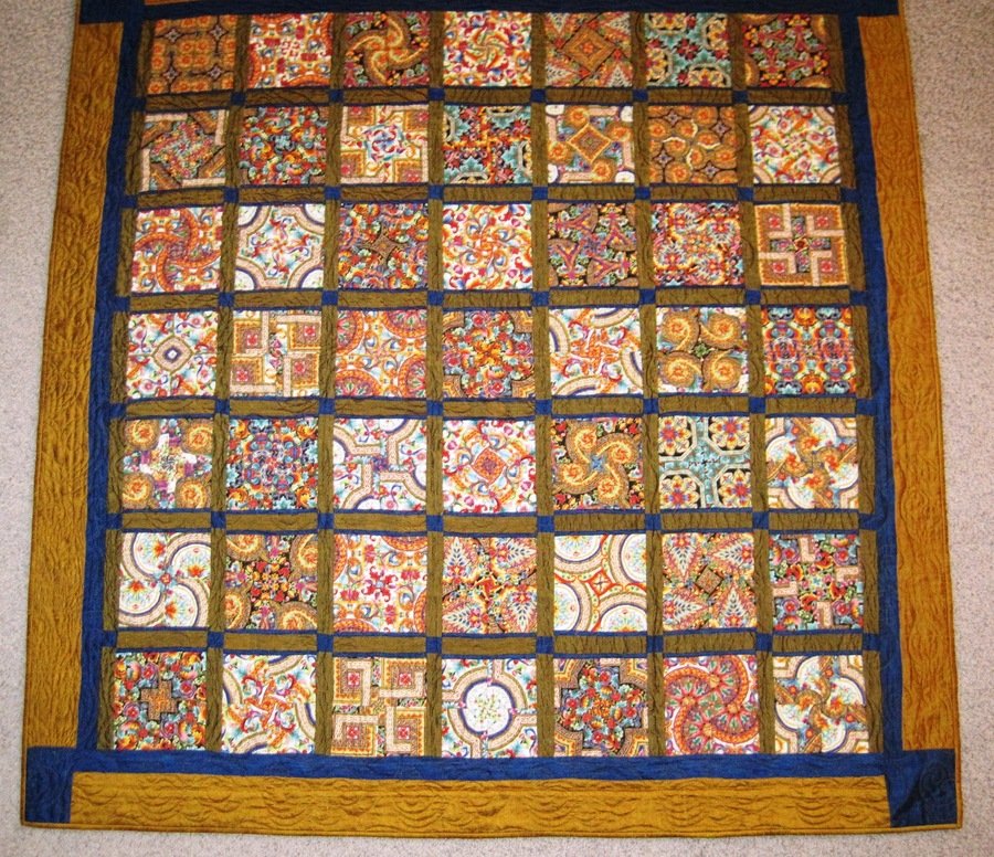 LYNNA DIVERSITY - I made this quilt for my brother, Jeff. The fabric speaks of diversity to me. I love the detail in this fabric. When it is cut into smaller pieces, each square still looks beautiful individually or as part of a group. The configurations remind me of how my brothers sees people: all different, all having something unitue to offer in their own special way. I ended up liking the back as much as the front. The back is also uploaded on my profile. It was machine quilted by Linda Theifolt.