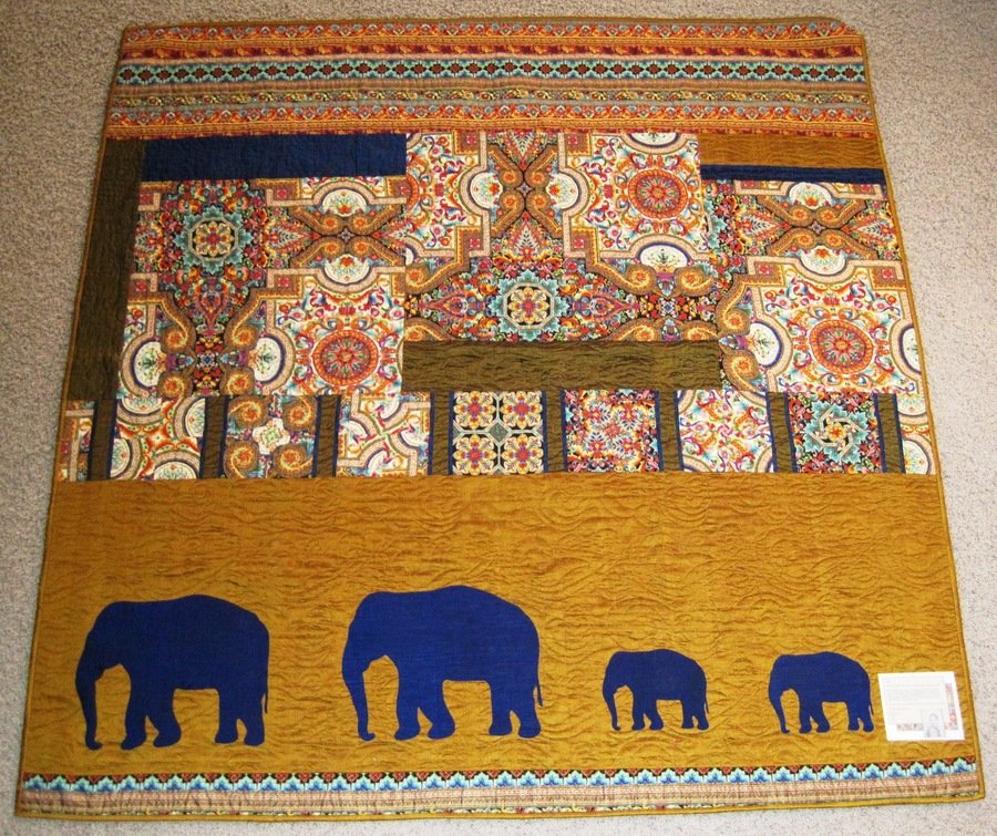 | Design Source - Description | I USED SCRAPS FROM THE FRONT SIDE OF THE QUILT. THERE WAS A LARGE OPEN AREA AND MY BROTHER LOVES ELEPHANTS, SO MY FRIEND WANDA USED HER CRICUT MACHINE TO CUT ELEPHANTS. HE LOVED THEM ON THE QUILT. |