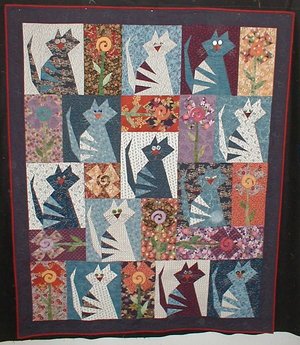 JAFO1 Stray Cat Blues - Buggy Barn pattern with the cats done in blues and indigos and the flowers done in asian fabrics. I just like this one... the cats are fun and the whole vibe of the quilt is amusing to me. Picking out just the right buttons for each cat's eyes was SO much fun!
