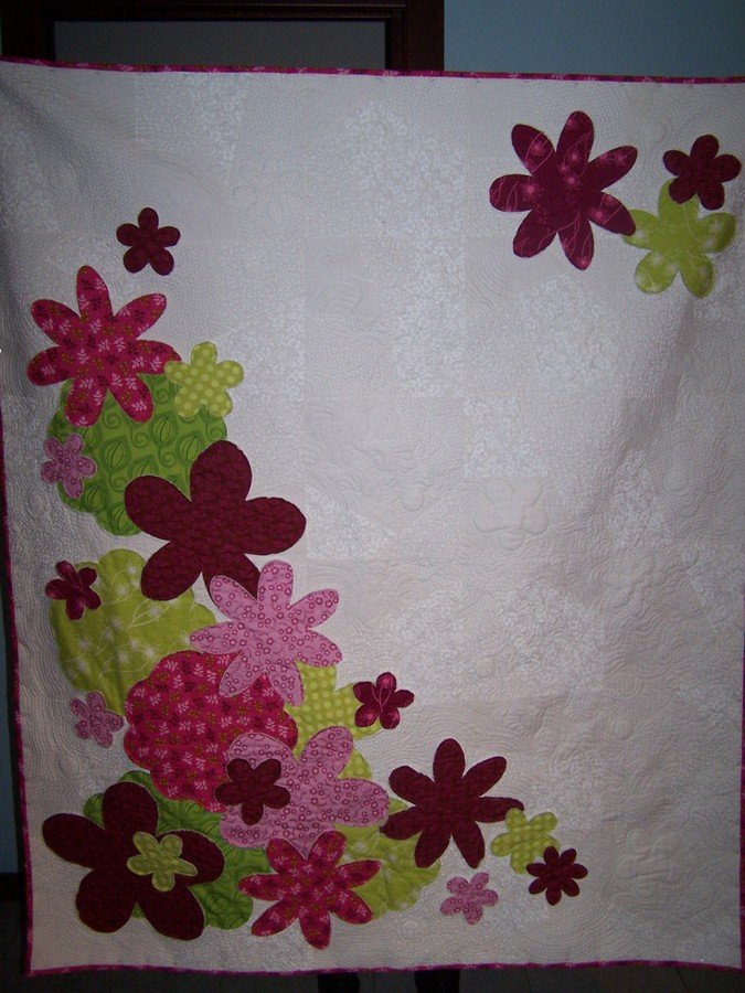 DireFareQuiltare Garden Party - A reproduction developed to be exposed in our quilt shop of the Abbey Lane pattern Garden Party. Quilt top composed by simplified crazy block made of tone in tone white fabrics. Completed with some appliqued flowers with batting and quilted with echoes around the flowers and McTavishing as filler of all the remaining background.