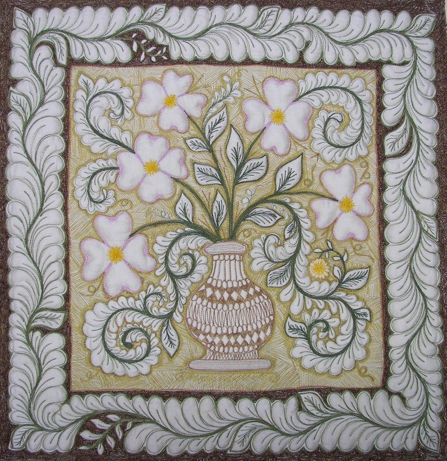 TammyF Feathered Dogwoods - Towards the end of 2009 I challenged myself to do a small wholecloth with colored threads and no marking. I finally finished it in December of 2010. This was done on a piece of ivory sateen fabric. All of the color is from threads. The quilting was all hand guided on my Gammill Classic Plus long-arm machine. This will eventually be framed with a barnwood frame and hung in my studio.