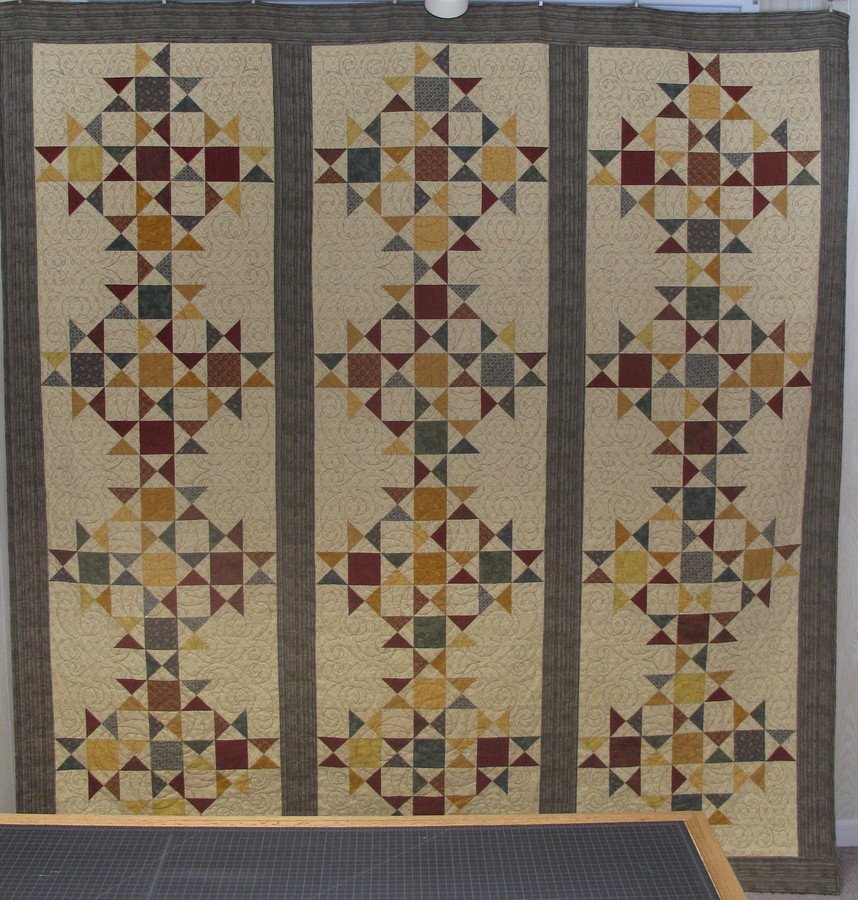 MaryRinWI Hot Dog! - On the way home from a retreat in the summer of 2011, my sister and I stopped at Millhouse Quilts, and I challenged myself to make a quilt entirely from their sale room, including the pattern book. (I did buy the sashing/border fabric at full price because it was just too perfect!) I gave the pieced top to my husband for Christmas that year, but then it sat on the shelf because I was afraid to quilt something that big! In February of this year, I decided the time had come, and finished it. I chose the colors for Wisconsin sports teams (green and gold for the Packers and red for Wisconsin) figuring we would wrap up in it while watching our big screen. All I could think of when I was working on it was ketchup, mustard and pickle relish, so I named it "Hot Dog!" We love it.