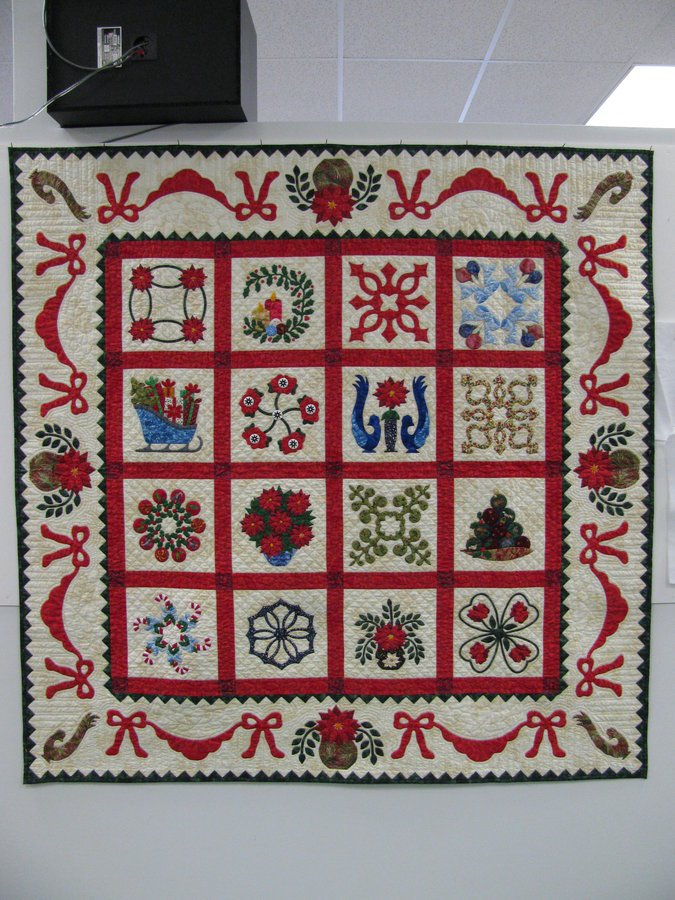 Tigercatindia A Joyful Baltimore Christmas - These are small Baltimore Album style blocks appliqued using back-basting techniques. The border treatment is of my design using a swag pattern from a book (have no idea which one) and enlarging elements of Connie Sue Haidle's patterns. Feathers, channel stitching, cross-hatching, outline, and echo quilting comprise the quilting scheme. Over 356 yards of Sulky 12-weight thread is hand-quilted into the top. It took most of 2009 to applique and half of 2010 to hand-quilt.
