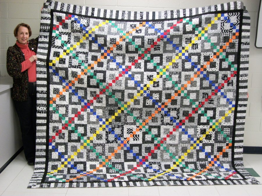 2LEARN Sarah's Black and White Birthday - Design is two blocks with black and white reversed. The pattern was adapted from a 12 inch block down to a 9 inch block. Each block is a 2 sided arrow with a diagonal of a solid color. The 5 primary colors form diagonals across the quilt. The outer border is piano keys. The quilting is a beautiful curlique pattern opened up in black.
