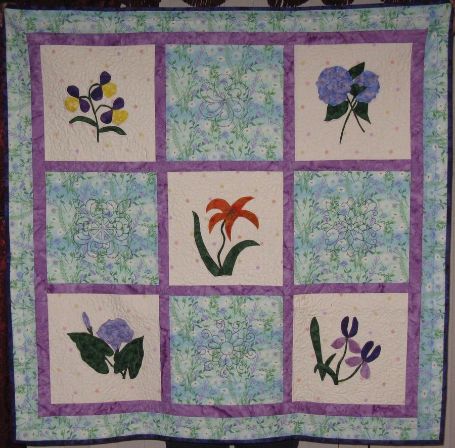 quiltedcreations Spring Fever - I found the Morning Glory and Hyacinth block patterns at a Hancock Fabrics clearance table and picked them several years ago -- last spring, in a fit of Spring Fever, I decided to make the blocks and then searched through coloring books and online free patterns for the other 3 flowers to make the quilt. When done, I needed to fill the large separator blocks, so decided to try some quilt squares on my embroidery machine (for the first time) and was very pleased with the results.