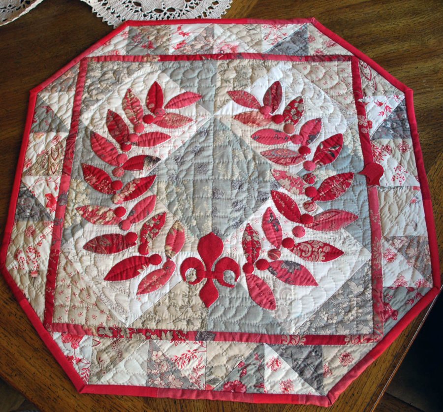 aznancy Laurel Wreath - On the first French General group trip to Auty, France, we were each given a charm pack of the yet to be released Rouenneries collection by French General from Moda fabrics. I wanted to make a little quilt as a reminder of this trip. I designed this quilt to utilize every scrap of that charm pack! It is appliqued onto a background of pieced half-square triangles. The corners are angled, simply because I ran out of fabric. The binding is pieced small red scraps pieced together with about 15 inches of non-group fabric to finish it off.