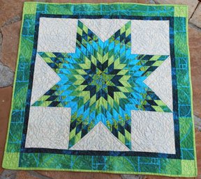 aznancy Lone Star - I fell in love with the lime green and aqua combination of fabrics that had been sitting in my sewing room for awhile. When I was asked to teach a class for a Lone Star quilt, I wanted to make one that was a manageable size, but would create an interest in the class. This quilt was the result.