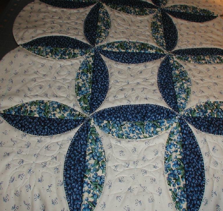 trishr929 Blueberry Surprise - The fabric came first, and I knew I wanted something special from it. I also wanted it to be mine completely, so I had to also be the quilter. I finally decided on this pattern, first I made the circles, then I quilted the centers of each one, then I finally put all the circles together and stitched down the folded cresent. I anticipated getting a queen size quilt from it but the amount of fabric it took up made the quilt just a twin size. I still love it!