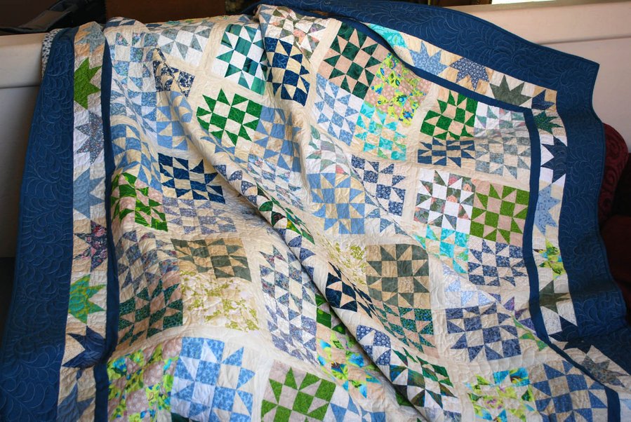 aznancy Blue Twinkle - This quilt was made from mostly very old scraps (20 - 25 years old), with a few exceptions. The pattern was perfect because in this book, 5" squares are the primary source for fabrics. It went together beautifully, and the block pattern really set off the fabric nicely (even if the fabrics themselves weren't so lovely anymore!)