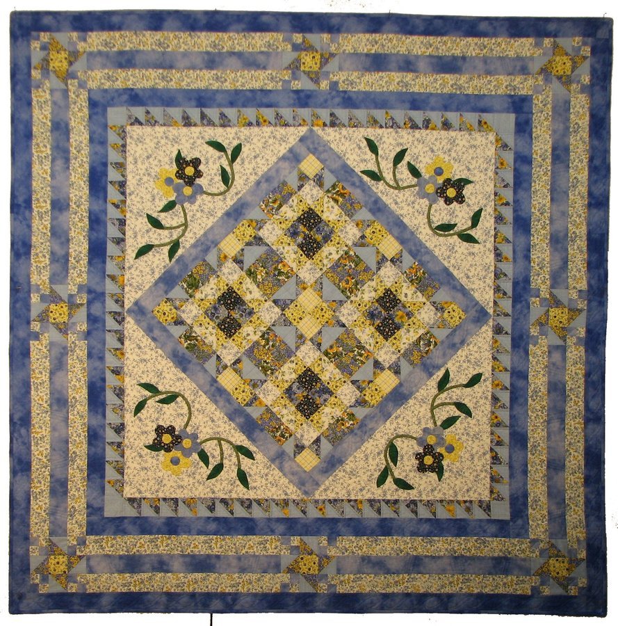 susmcc Medallion Erad - This quilt was an experiment in design. It is the first quilt that I designed. It is made up of several elements. The most unusal design element is that one of the borders is the reverse of the dark blue fabric. I needed a lighter shade and could not locate it.