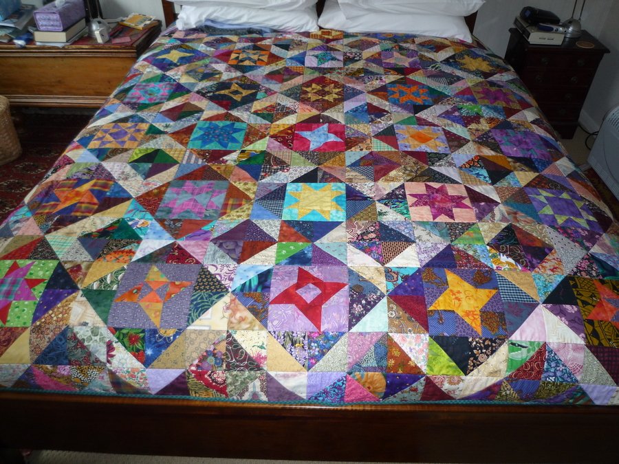 | Design Source - Description | Wonderful scrap quilt pattern whereby 6" stars are bordered by darker/lighter HST's to form a 12" block. These form a secondary pattern when the blocks are set side by side. An HST border completes the look. |