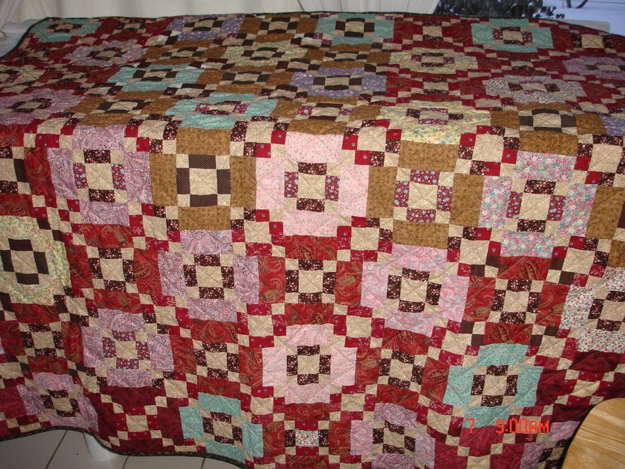 | Design Source - Description | A totally scrappy quilt using only stash fabric. Three values--dark using brown or red, light using tan, medium using small floral pastels. Cotton batting, machine quilted on a diagonal grid using a hand stitch. |