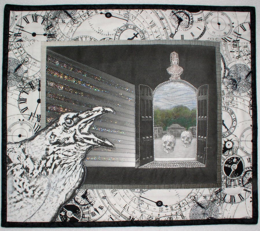 rickieseifried The Raven - The Raven was created around a challenge to pick a favorite poem and make a quilt to depict the poem. I used a combination of two photos for the background which was painted and quilted to give texture and depth. The foreground of the raven is a photo printed on cloth.