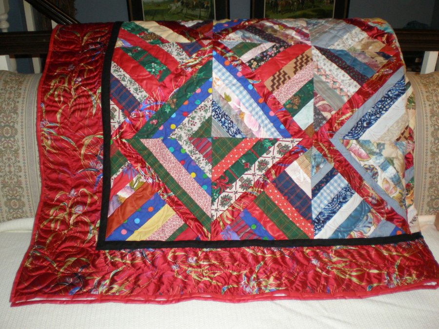 lovingstitches Unknown - A string quilt made out of several different kinds of fabrics that ment something to her. The outside border and some of the strings are made out of silk.