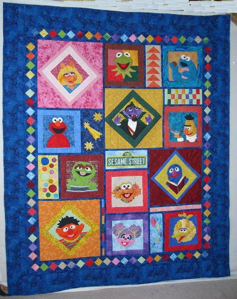 | Design Source - Description | 60X70 inches. Machine applique, machine quilted. 10 of the 12 block patterns from the book "Quilting With the Muppets" by the Jim Henson Company/ Two patterns adapted from coloring pages. |
