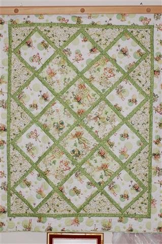 rosehillann Green Flower Fairies - Made for my Grandaughter who loves fairies. Free motion quilted on my home sewing machine. Her room is decorated with cut-out fairies from the fabric and applied to large dots of color on the walls.