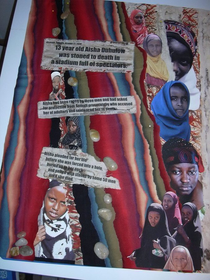 | Design Source - Description | This quilt was inspired by a news article about a 13 year old girl who was raped and then stoned to death for adultery in Somalia. |
