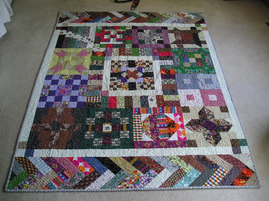 NancyinSTL Jelly Roll Sampler Picnic Quilt - Using a scrappy jelly roll, I started with sampler blocks found at moosequilts.blogspot.com To bring unity to my blocks, I placed them around a scrappy 24" medallion block which was loosely based on the "Modern Medallion Pillow" pattern tutorial that I found at www.modabakeshop.com by John of www.quiltdad.com To make the quilt larger, I added the braided borders. Since I plan to use this quilt as a picnic quilt, I used denim for the backing, sturdy home dec cotton for the binding, and added a strap with Velcro (a la Elizabeth Hartman's Rec Center Picnic Quilt). This was my first time free motion quilting and I used the tissue paper marking method. The quilting is far from perfect, but I am getting the hang of FMQ.