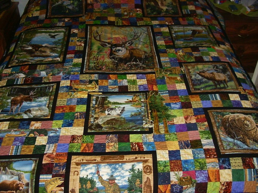 netsuki The Great Outdoors - I had so much fun with the making of this quilt for my son, Brian, for his 45th birthday. I used panels, which I cut apart and framed in black; then put my 2 1/2 inch squares together and surrounded each framed panel. Then I appliqued "camping" themes all over.