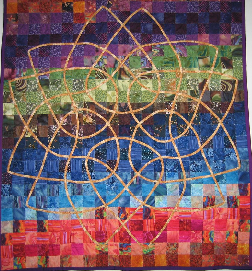 Norrie Wave of Colours - Using a colour wave of cotton fabrics finished to 2" squares. (Represents colours of our environment) Has Celtic Knot applique representing continum of life.