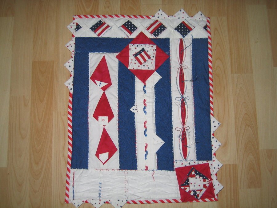 Norrie Red, White and Blue - Manipulation of fabrics--twist, fold, and sew as learned from a class taught by Jeannie Raymont.