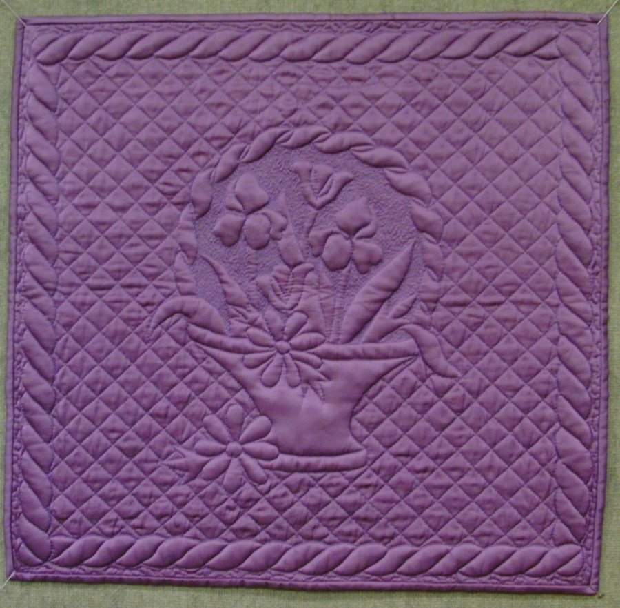 JAFO1 Iris Basket - Whole cloth quilt on Radiance fabric (cotton-silk blend). Done on a Bernina 440 without the use of stitch regular or walking foot. 20'x20". My first real attempt at trapunto or doing a whole cloth quilt.