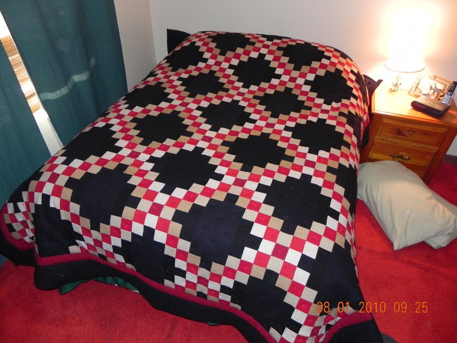 MaryVal Remembering Anastacia - This is a large full sized 100% wool quilt top, made from wool garments purchased at the Goodwill stores. It has 2 wool battings in it, a flannel backing and 3/4 inch flannel binding. It is tied with 6 strands of DMC embroidery floss. Named it for my Irish grandmother Anastacia, who made quilts from my grandfather's wool business suits. Strip pieced, 2.5 inch strips.