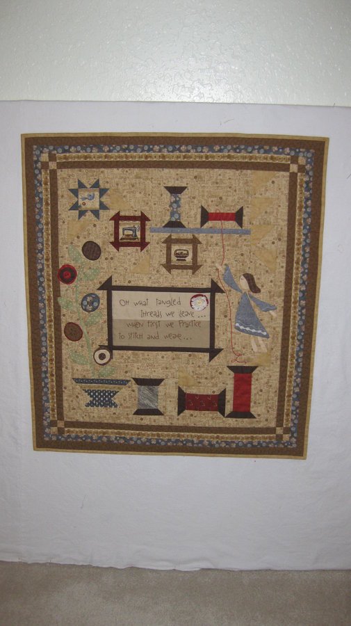 19judysk41 Tangled Threads - I love words on quilts and when I saw this pattern in a book I knew I had to make it to hang on the wall over my sewing machine. I embroidered the words on the little sampler in the middle of the wallhanging.