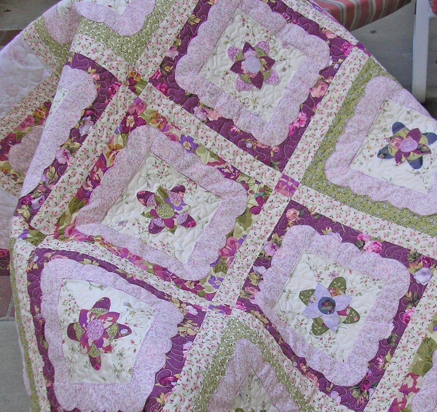 Ladylike Grape Ribbon - A sweet applique on the background of delicate white florals. Ea block is surrounded with a precious scallop edge. Each block is quickly finish with colorful machine applique. Treasure this quilt and the beauty it creates in your home.