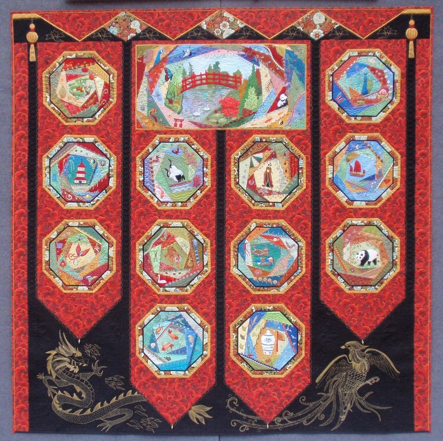 Linda56 Eastern Elements - Contemporary Crazy Quilt using free machine thread painting depicting an Asian theme.