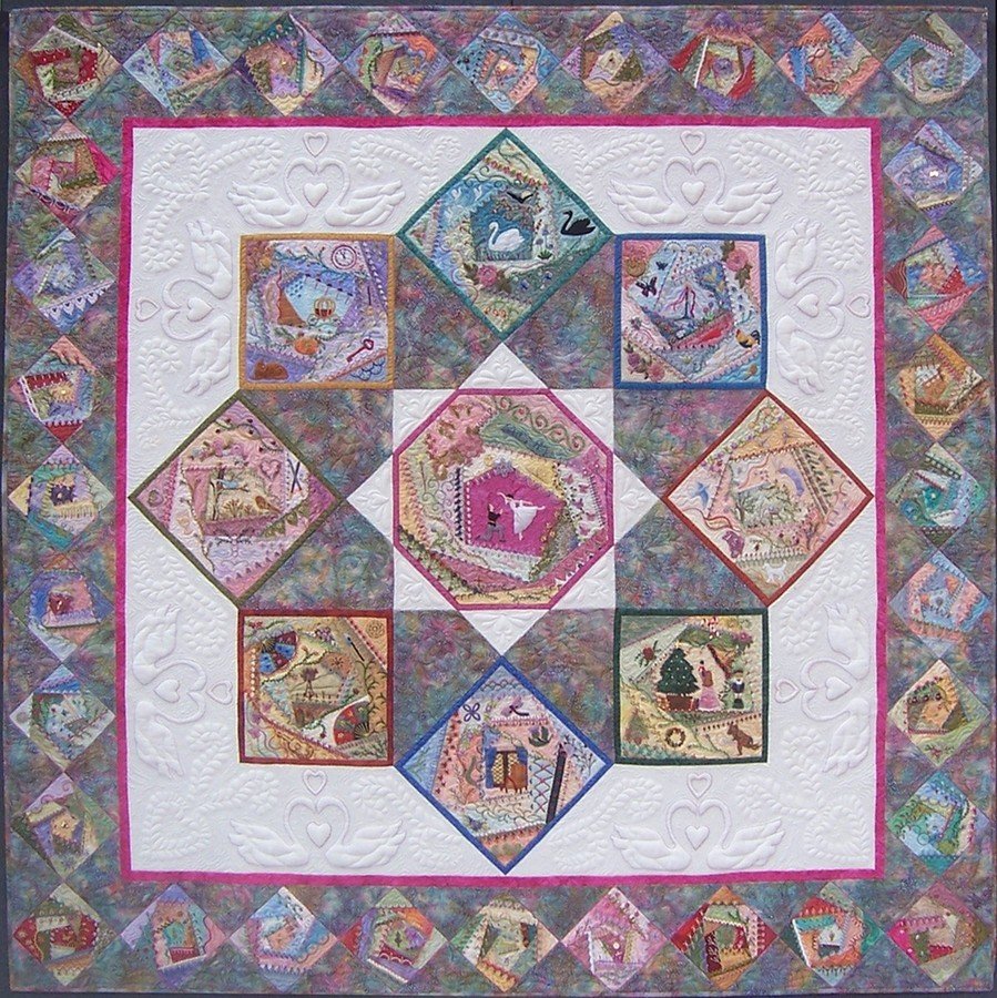 Linda56 Crazy About Ballet - Hand Embroidered Crazy Quilt depicting ballets including Swan lake, Nutcracker, Romeo and Juliet, Cinderella, La Sylphide, Giselle, Don Quixote, La Fille Mal Gardee and Sleeping Beauty