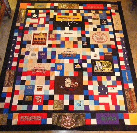 galynn Rocky Mountain Elk Foundation Quilt - This quilt is made from shirts acquired by the owner, through their membership in the Elk Foundation. The top is make completely from these shirts, using the logo's and fabric from the body and arms of the shirts, pockets are also used.