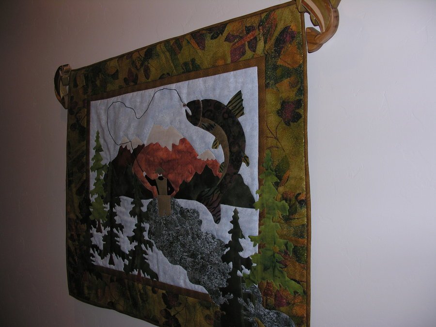quiltsncatz Any day fishing.... - Purchased pattern and border fabric in Calgary Canada. Wall hanging was gift to my ardent fly fishing husband. Ends of hanging rod are fish handmade in 20 different woods; commissioned and made by a friend.