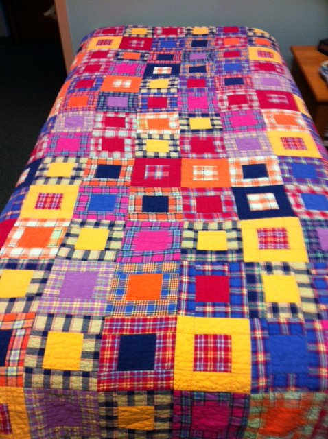 RiverOwl Floppy Flannel - I saw a quilt that was a square inside a square on a cover of a quilt magazine and thought I can do that. For some unknown reason I did not buy the magazine that had the pattern probably because since I had not taken any quilting classes yet I didn’t think I would be able to read or follow the directions anyway. My husband & I went to Joanne’s fabrics since the quilt was for him at work (he is a Fire Captain) and he saw a crate with flannel fabrics all put together & I said okay you’re the one that has to look at them, if this is what you want! This was the result and he says he loves it! I had no pattern, had no idea what I was doing just knew seams had to match, so that is what I did. Wasn’t too bad & he is still using it eight years later at the fire station! Machine quilted stitch in a ditch.