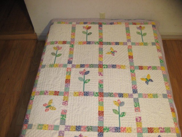| Design Source - Description | I made this quilt for Hattie's sister Ryleigh. I used the Oopsie Daisy flowers, then added some butterflies appliqued off center. These two granddaughters now have quilts that are similar but different. |