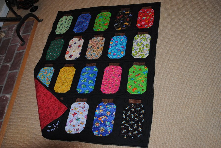 RiverOwl Mason Jar with bugs - I chose bug fabric which took me four years to find all the fabric in many different States to make four quilts at once. This is a photograph of the first to be completed. All tops are completed for my Granddaughters as they love bugs! Now it looks like you can go on-line and get bug fabrics from one place!! Arg-g-g. These fabrics we got from SC, NC, GA, NV, & TN. We were very patient until we were able to get enough but the Granddaughters weren’t old enough anyway! I plan my quilts years ahead of time for them!! I will put different color backings on them so each Grandchild can tell them apart.