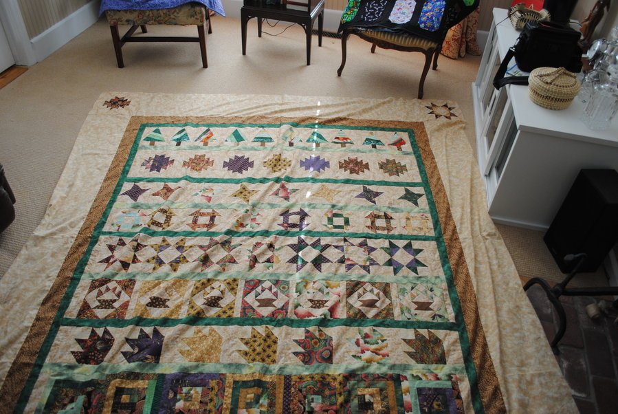 RiverOwl Row by Row - Started in a class in 2004 never finished. I am adding on one more border and I will be putting the three layers together, I swear I am going to finish this quilt!! It was a mess, since it was my first big quilt, it started as a queen, it is now a king! I am trying to get all my UFO’s done now that I have retired! Making progress. . .new updated photo..